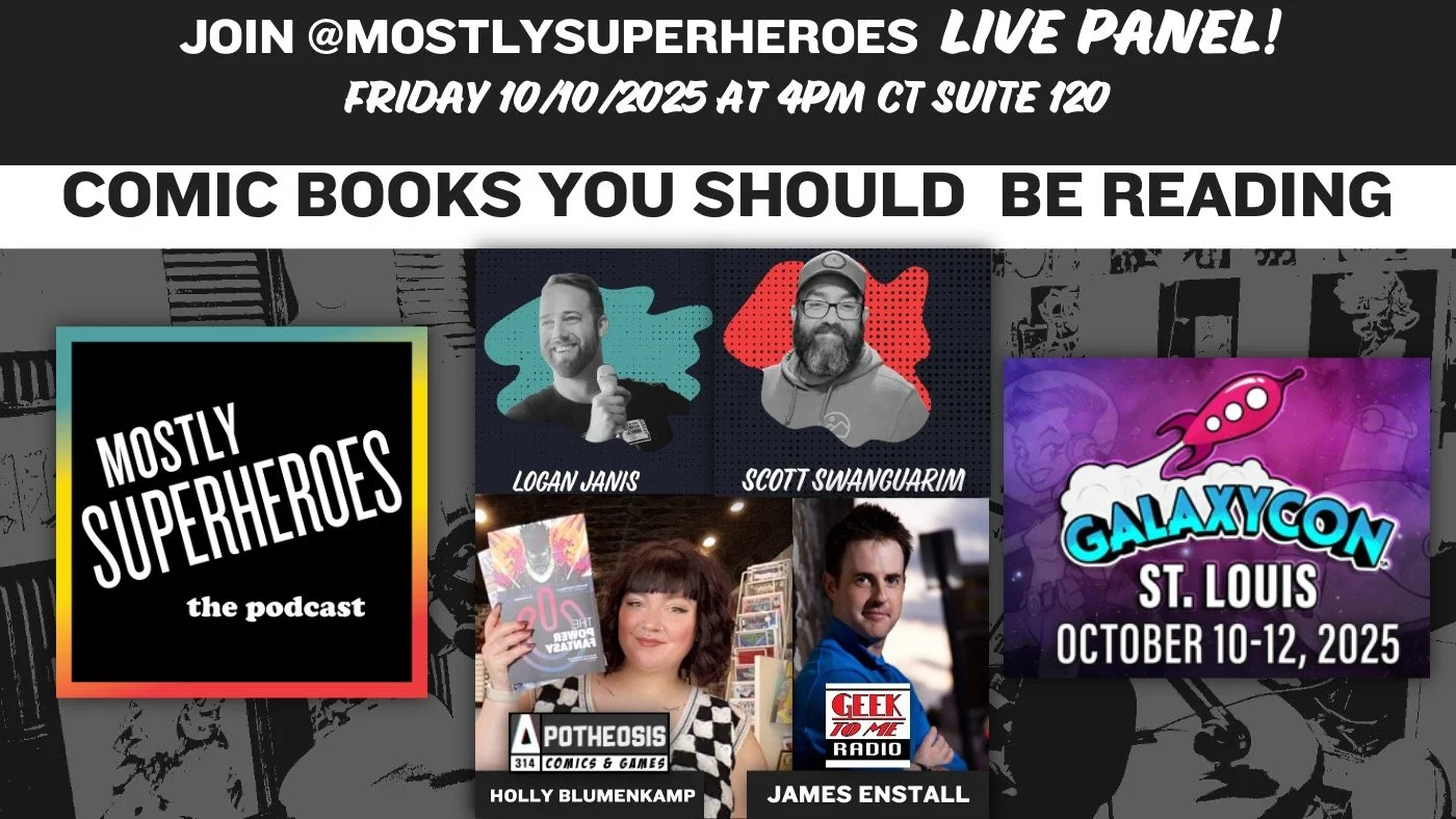 Logan and Scotty from Mostly Superheroes host a LIVE panel at the first ever 2025 GalaxyCon St. Louis featuring Holly Blumenkamp from Apotheosis Comics & Games and James Enstall of Geek to Me Radio and 2 Rivers Comic Con! Enjoy and support your favorite indie podcast and comic book shop today.